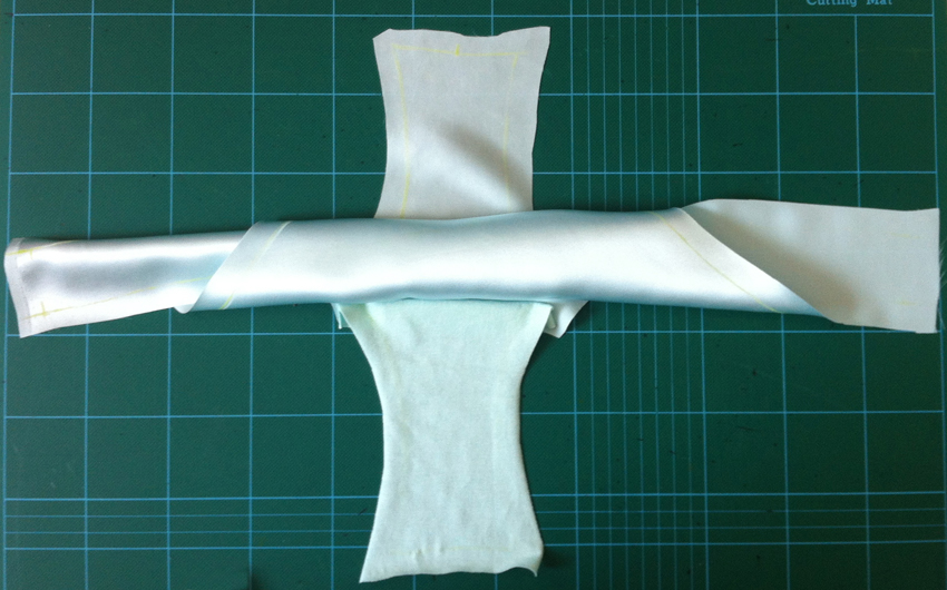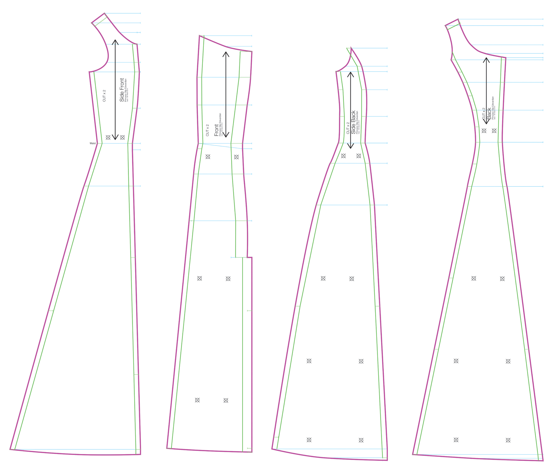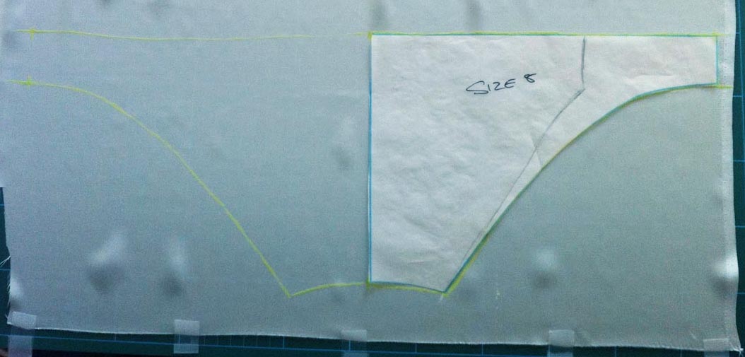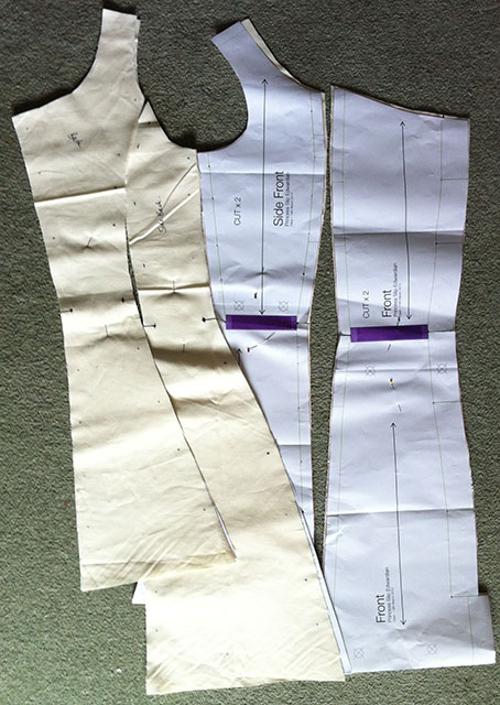 I am at last heading towards the climax of this story. With the pattern altered under the arms, I swapped the pieces around a bit so I could add some balance marks, to make joining all final pieces together easier. I also lined them up a bit so I could look at the bottom hem… I am still hoping the length will work as well as the rest of the pattern did.