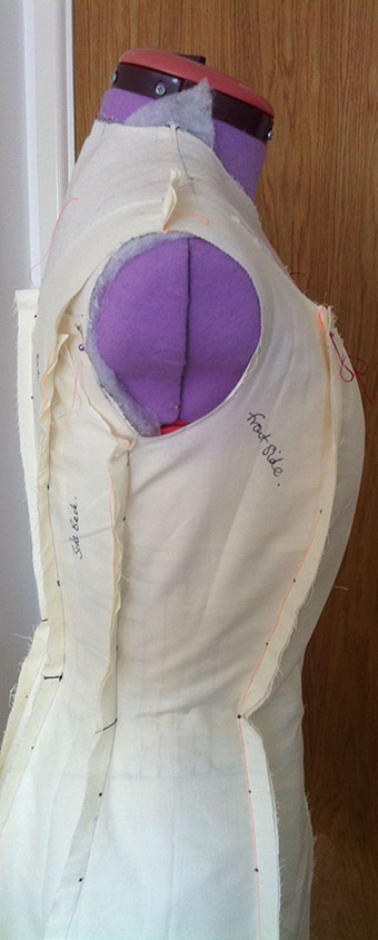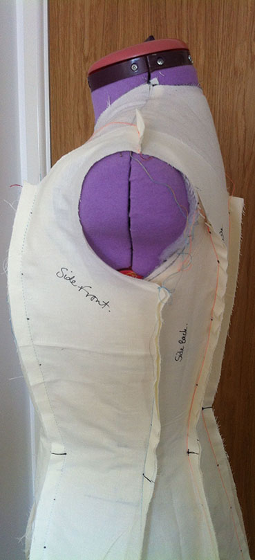 The armhole depth I take down only on the base as I don’t want to ruin the shape of the shoulder strap on the Back section, so I only reshaped the Front and Back Side sections. I then trimmed this back ‘only on one side’ so if not quite right I can redo again… then re-tried this on. When happy I transferred onto the digital pattern.