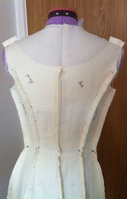 I printed out all the pieces joined together for the toile. I decided to use a medium weight cotton which will be similar to the cotton I want to use but not as expensive, also I decided not to do the full length, stopping below the hip, just to save time and material. I then marked on each piece what it was and also the seam allowance, just with a few dots and waist line.
